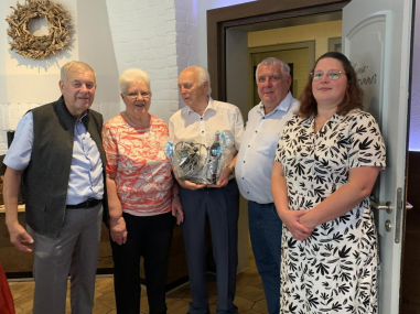 Unser Ehrenmitglied Werner Jeltsch feierte mit Ehefrau Erika am 26. Juli 2025 ihren 65. Hochzeitstag im Gasthof „Zum Löwen“ in Merzen. Zur „Eisernen Hochzeit“ überbrachten auch die 1. Vors. Janine Hilgert, der 1. Sportleiter Manfred Klose und Geschäftsführer Hans-Jürgen Junga die besten Glückwünsche und ein Geschenk vom Radsportverein „Frisch-voran 07“ Bramsche, mit dem Werner schon 75 Jahre verbunden ist.