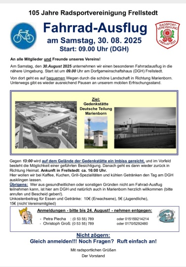 Vom 15.08. bis 17.08.2025 fand der Jugend Ausflug der RSV Frellstedt statt. 25 Kids /Jugendliche und Betreuer waren mit dabei. Auf ging es am Freitag mit dem Fahrrad durch Feld und Flur nach Räbke.